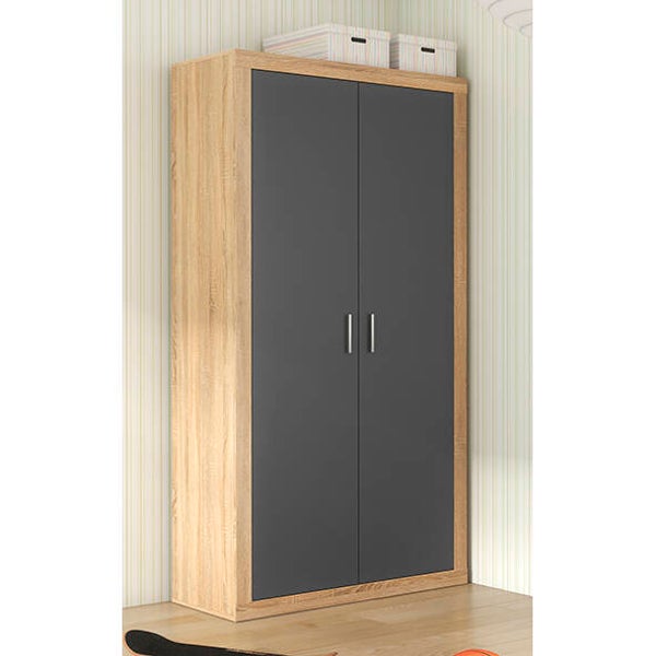 Armario de dos puertas de abrir con tiradores en color plata. Interior con 1 estante y 1 barra para colgar como muestra la foto.