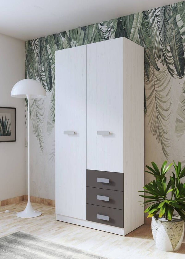 Armario de dos puertas y 3 cajones con tiradores color plata. Interior con 1 estante y 1 barra para colgar como muestra la foto.