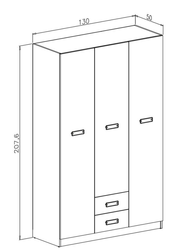 Armario de tres puertas y dos cajones con tiradores color plata. Interior con 2 estantes y 2 barra para colgar dividido en los dos lados del armario como muestra la foto.