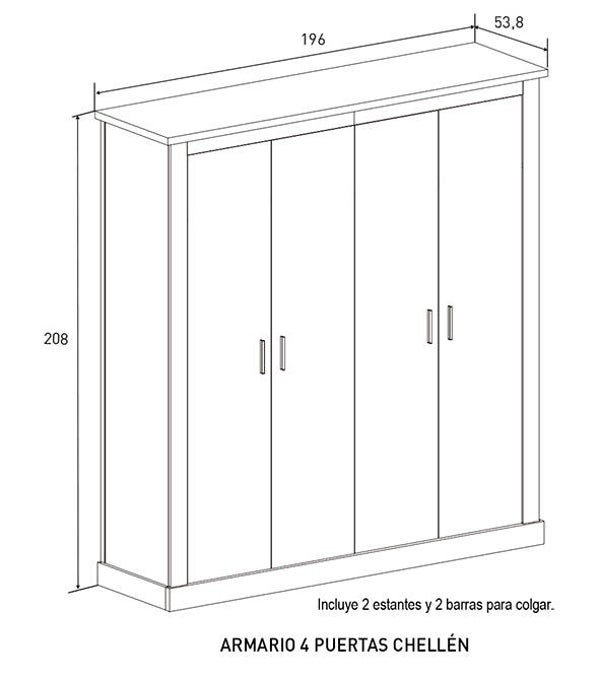 Armario de cuatro puertas con tiradores color plata. Interior con 2 estantes y 2 barras para colgar como muestra la foto. No incluye cajonera