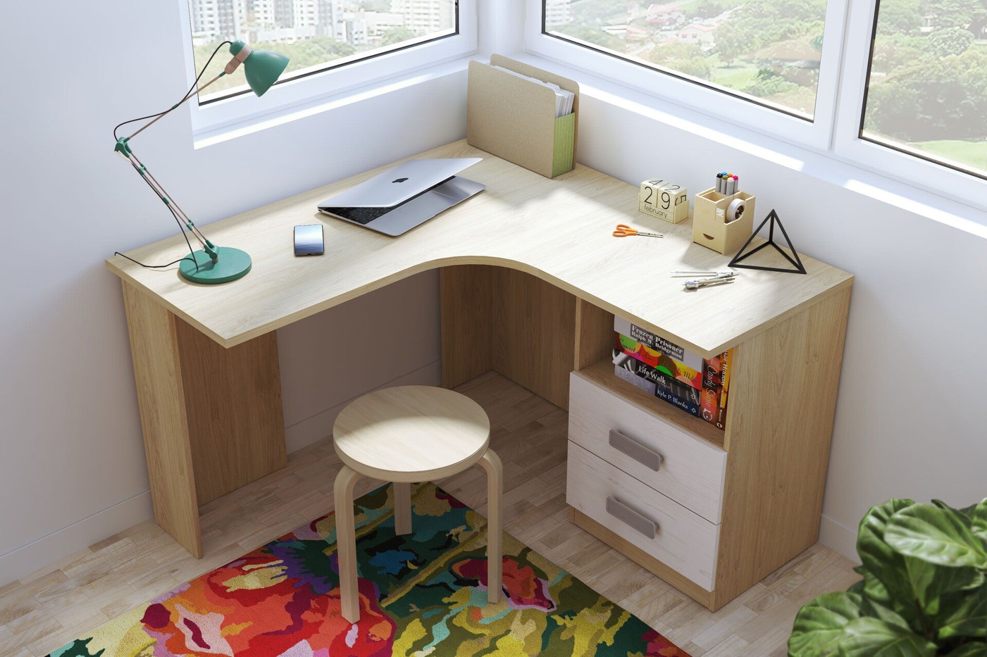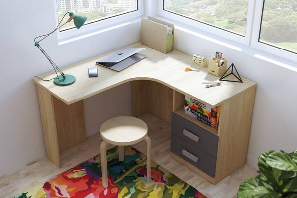 Mesa de estudio de rincón con 2 cajones con corredera.