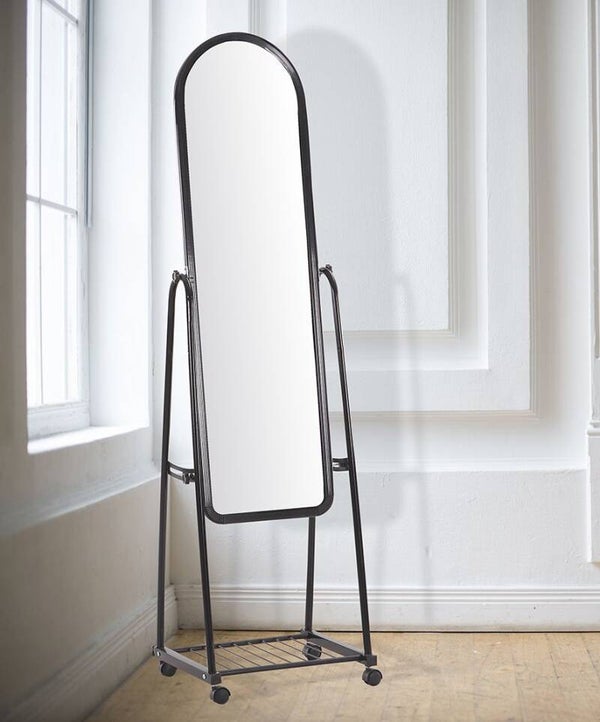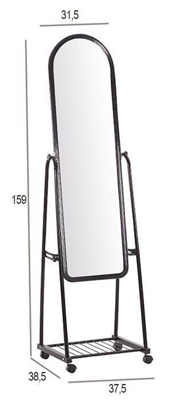 Espejo con estructura metalica en color negro con base con estante de apoyo y ruedas