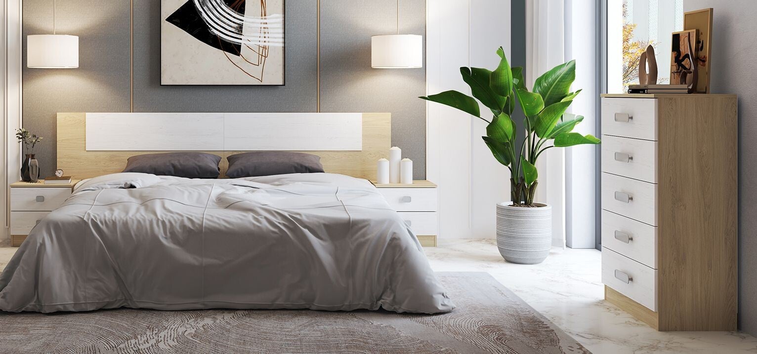 Composición de dormitorio con 1 cabecero+2 mesas de noche+1 sinfonier. (No incluye cama)