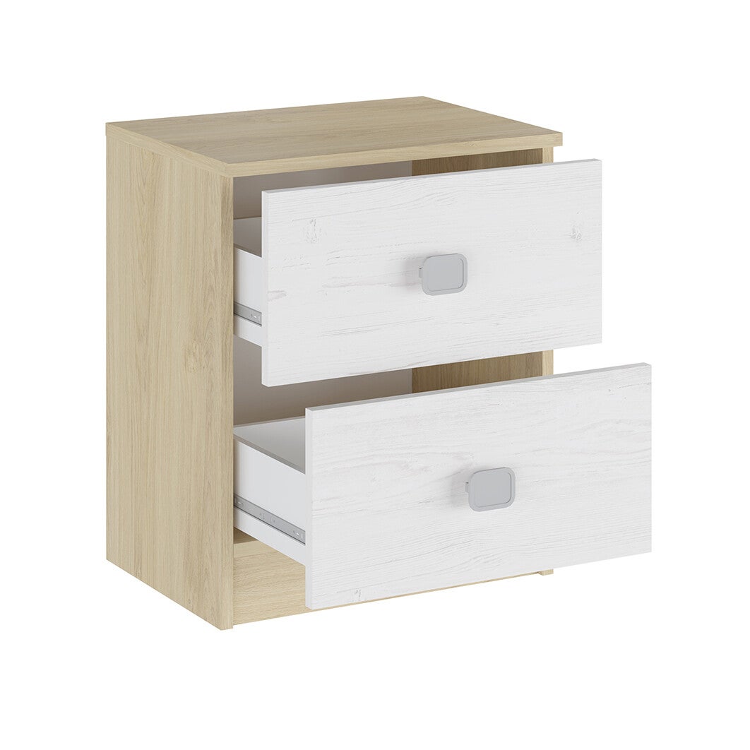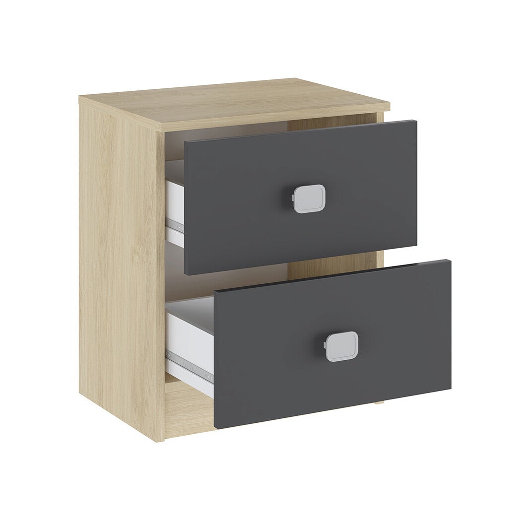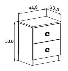 -Mesa de noche con dos cajones de melamina con tiradores color plata