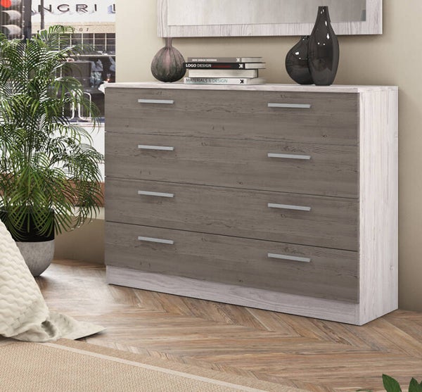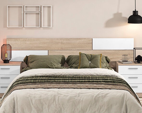 Composición de dormitorio con 1 cabecero+2 mesas de noche+1 cómoda+1 espejo. (No incluye cama)