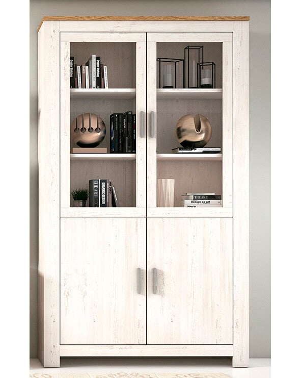 -Vitrina con 2 puertas con cristal y 2 puertas de madera y tiradores en color plata