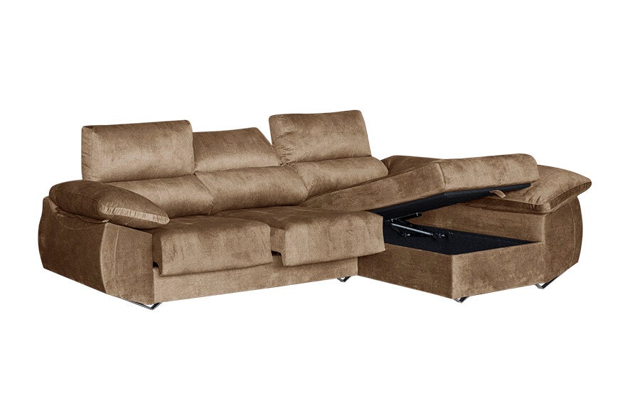 Sofá chaise longue con asientos deslizantes y arcón en el chaise longue. Chaise longue del lado derecho mirandolo de frente, como se ve en la foto