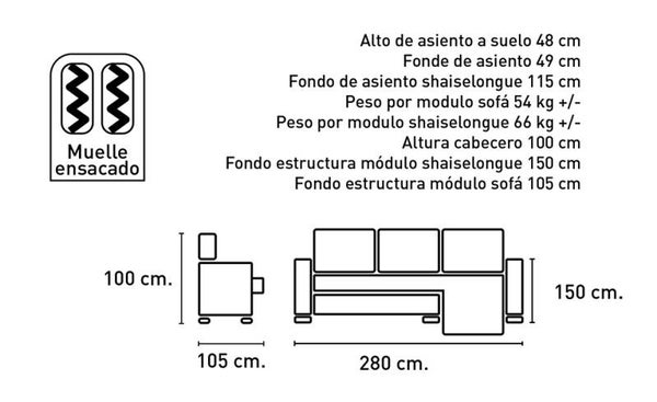SOFÁ CHAISE LONGUE IZQUIERDO ASIENTOS DESLIZANTES CON RUEDAS AL SUELO 280CM VARIOS COLORES