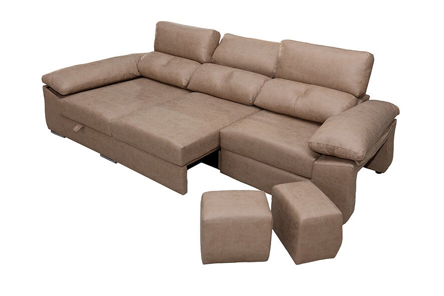 Sofá chaise longue, con 2 asientos deslizantes con rueda al suelo, arcón en brazo y 2 puffs. Chaise longue del lado izquierdo, como se ve en la foto