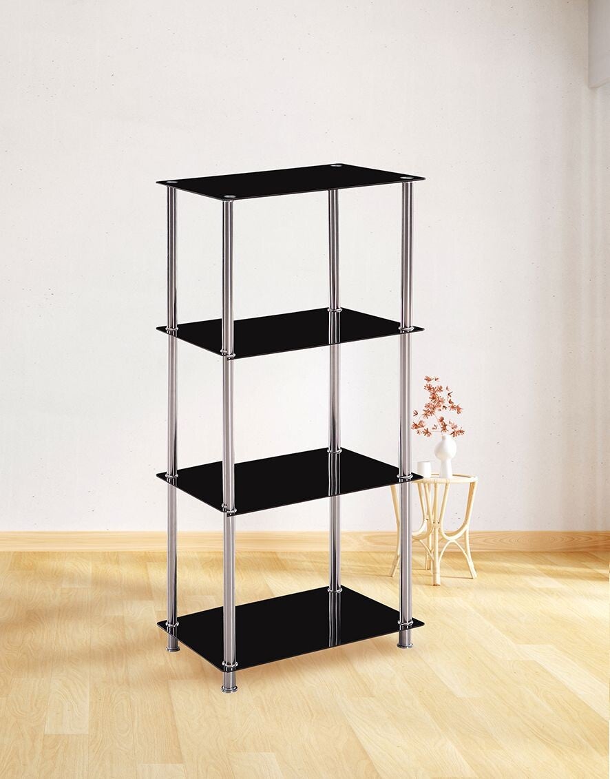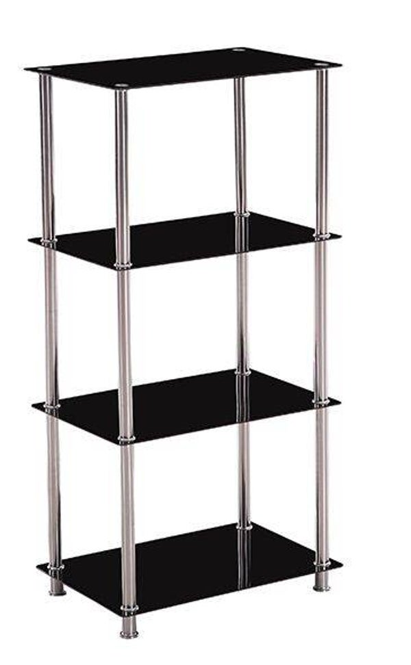 Estantería con baldas de cristal templado color negro y estructura con tubos de acero inoxidable