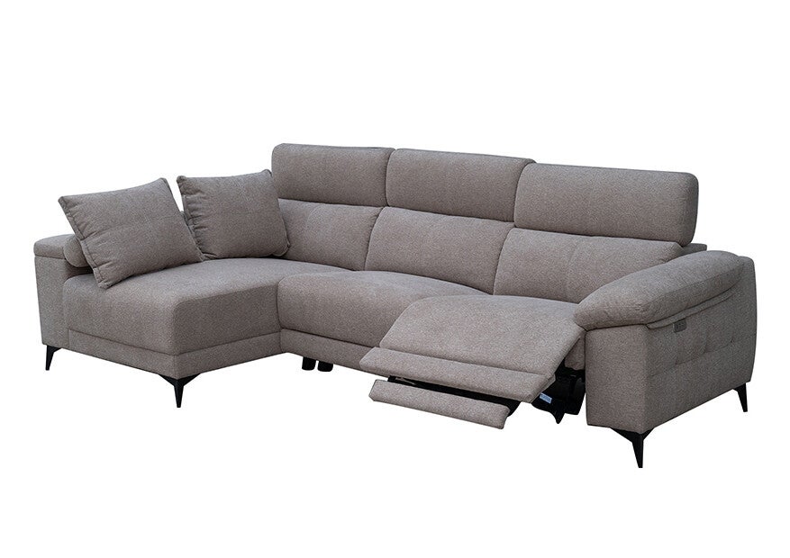 Sofá chaise longue con dos modulos relax motorizados. Chasie longue del lado izquierdo mirandolo de frente, como se ve en la foto.