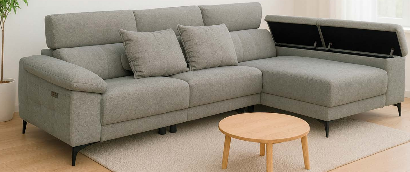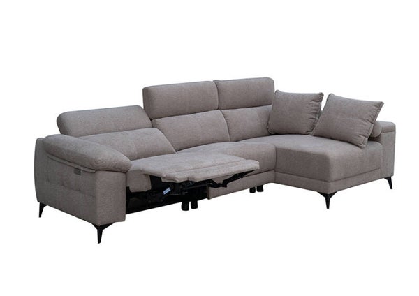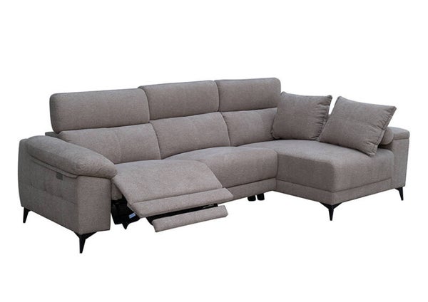 Sofá chaise longue con dos modulos relax motorizados. Chasie longue del lado derecho mirandolo de frente, como se ve en la foto.